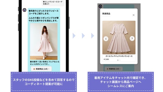 ※1:UGC:User Generated Contentの略称※2:繊研新聞社 ファッションECアワード2025より機能「visumo連携機能」は、ビジュアルマーケティングプラットフォーム「visumo」が収集・管理しているSNS上のUGCやスタッフによるコーディネート画像などの豊富なビジュアルコンテンツを「AIデジタルスタッフ」に連携させる機能です。