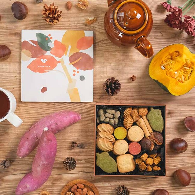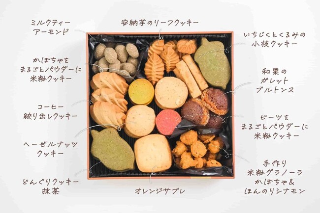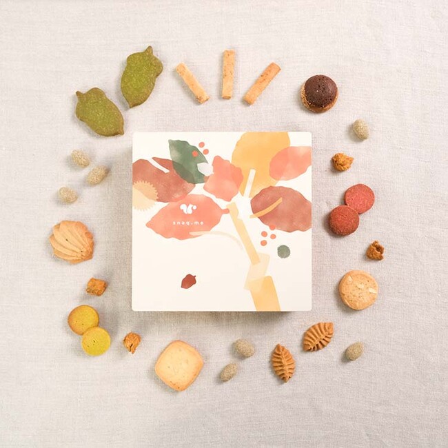 <スナックミー商品開発担当者より>秋の味覚をたっぷり味わえるようにラインナップを考えました。今回は9種も新作を入れられたので、新しい出会いがあると嬉しいです。最後まで飽きずにお楽しみいただけるよう、クッキー以外にもグラノーラやナッツを入れました。缶のデザイン同様に温かみのある雰囲気が出るよう、色味にもこだわっています。