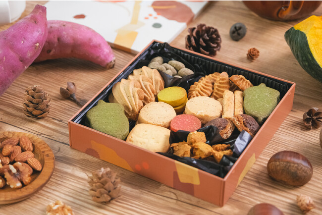 大きな木をシルエットで表現したデザイン缶の中には、和栗、安納芋、いちじく、くるみ、かぼちゃなど、秋ならではの味わいをお楽しみいただけるクッキーをたっぷりと詰めています。