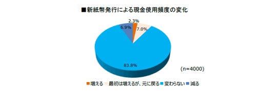 キャッシュレス化が進展した状況での新紙幣発行が現金の使用頻度に影響を与えるかについては、83.8%が「変わらない」と回答。“最初は使ってはみるものの…” という「最初は増えるが、元に戻る」7.0%と合わせると9割が変化しないと回答。「増える」は2.3%に過ぎず、キャッシュレス化がさらに進むと考えてか「減る」は6.9%となりました。