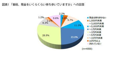まずは普段、現金をいくらくらい持ち歩いているかを聞いた結果が図表1です。28.9%と最も多かったのは「1万円~3万円未満」で、これに「5,000円~1万円未満」が23.0%で続きました。「3万円以上」も合計11.7%であることから、6割超の人が外出時に5,000円以上の現金を持ち歩いていることがわかりました。片や「5,000円未満」という人は合計24.6%、さらに、完全キャッシュレスということなのか、同行者が支払うからなのか、「現金は持ち歩かない」も2.2%と少数ながらいました。