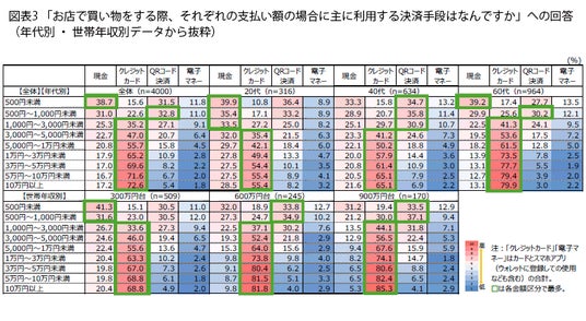 若年層は意外に “現金志向”? 店舗での買い物時に、支払い金額ごとで主にどの決済手段を使うか、図表2で利用率が高かった4種類(カードとスマホ決済の合計)についてまとめたのが図表3です。全体では、“500円未満”の少額だと38.7%が「現金」を使いますが、“500円~1,000円未満” では「QRコード決済」が僅差で首位になり、“1,000円以上” では「クレジットカード」がトップに入れ替わりました。「クレジットカード」の使用率は金額が上がるにつれて上昇し、“5万円以上” では7割超に。一方で「QRコード決済」は “3,000円未満” で3割前後なのが、支払額が増えるほどに比率が低下し、“3万円以上” では1ケタ台に。「電子マネー」も同様の傾向がみられ、チャージが必要なこれらの決済手段は比較的低額な支払いの際に使われていることがわかりました。その点「現金」は、“5万円~10万円未満” で16.7%まで下がりながら “10万円以上” では17.2%に再浮上しており、高額の支払いでも安定的に使われるのは安心感からでしょうか。