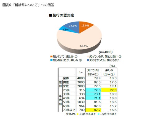 新紙幣発行の認知度は8割だが… 7月3日に1,000円・5,000円・1万円の紙幣が20年ぶりに刷新されました。5月末~6月初旬に行った本調査では、発行が半月後に迫った新紙幣についても、いくつか質問をしてみました(図表6)。