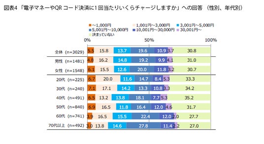 チャージ額は控えめ傾向 QRコード決済や電子マネーでは、クレジットカードや銀行口座との紐づけやコンビニなどでの店頭入金によりチャージする必要がありますが、1回当たりいくらチャージしているのでしょうか(図表4)。30.8%と最多は「決まっていない」に。残高を一定額にキープするため、使った分をチャージする、という使い方をしているのでしょうか。具体的な金額では「5,001円~1万円」19.6%に続き、「1,001円~3,000円」15.8%、「3,001円~5,000円」13.7%となりました。「1万円超」が計14.6%にとどまるのは、“使い過ぎ” を警戒して、ということもありそうです。年代が上がるほど1回当たりのチャージ額が増える傾向もみられました。