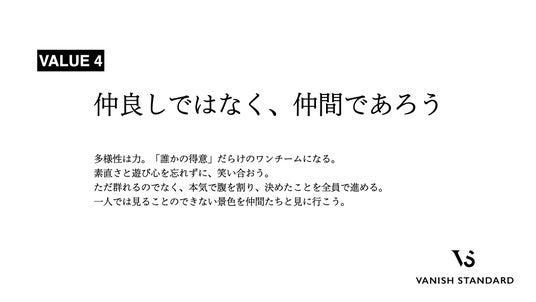 今後も常識を革め、STAFF STARTのサービスビジョンである「好きを、諦めなくていい世の中を。」実現へさらに加速度を上げていくためには、社員全員で、バニッシュ・スタンダードで働く上でのバリューを再度言語化する必要があると考え、「バリュー再定義プロジェクト」を発足。様々な議論を経て、この度のリニューアルにいたりました。