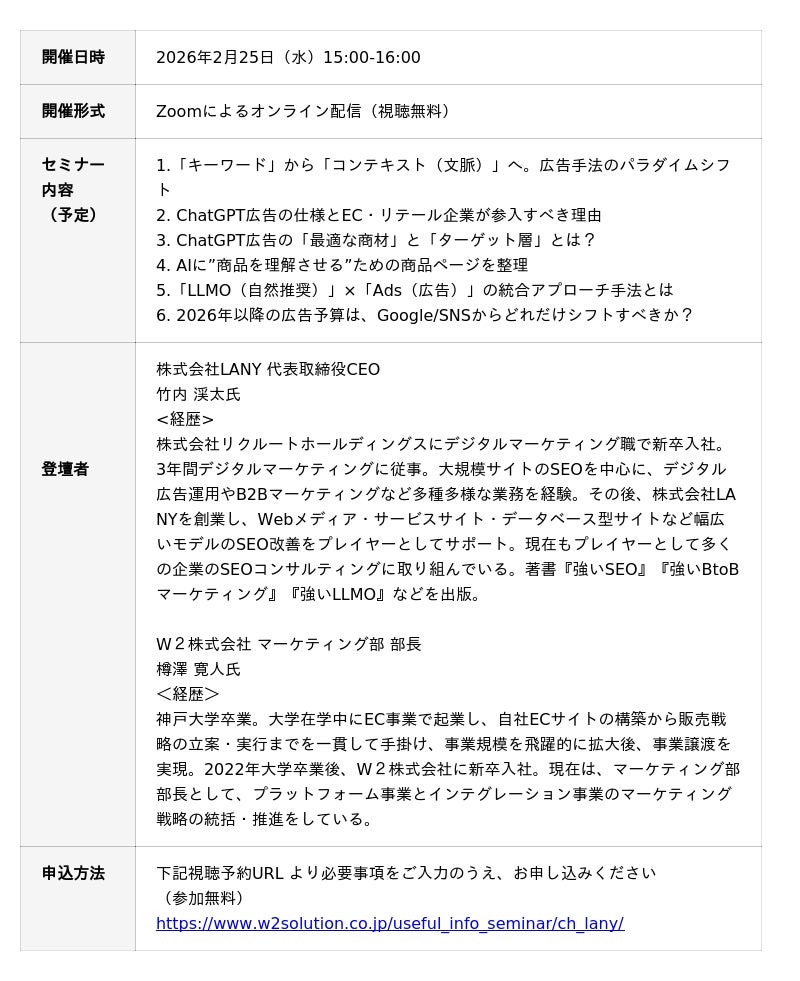 事業形態に合わせたコマースプラットフォームを展開するW2株式会社(本社:東京都中央区、代表取締役:山田大樹、以下W2)は、映像メディア 「Commerce Hack」 にて、"ChatGPT広告解禁!EC/リテール企業に及ぼす影響と「対話型コマース」時代の集客戦略"をテーマとしたライブプログラムを2026年2月25日(水)15:00より配信いたします。