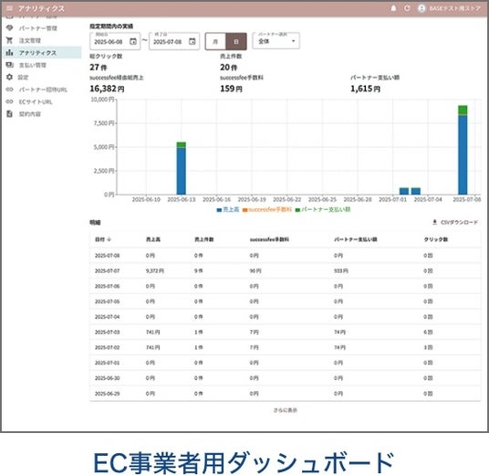 広告に依存しない、効率的な成果報酬型パートナー施策をすぐに始められる販売パートナーとの契約はオンライン上で完結し、専用のURLやQRコードも即時発行されるため、スムーズに施策を開始できます。成果や報酬の状況も、EC事業者用・パートナー用それぞれのダッシュボードを通じてリアルタイムで可視化できるほか、マージンの計算から振込までを自動化することで、煩雑な事務作業を大幅に削減し、効率的かつ透明性の高い運用を可能にします。