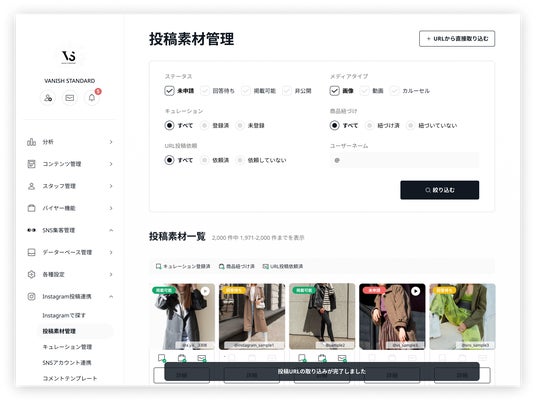企業・ブランドのファンを集める新機能「キュレーション」「キュレーション」は、Instagram投稿をハッシュタグ検索し、ユーザーへの自社ECサイトへの掲載依頼や投稿商品の紐付け、掲載作業、効果測定まで行えるUGC機能です。