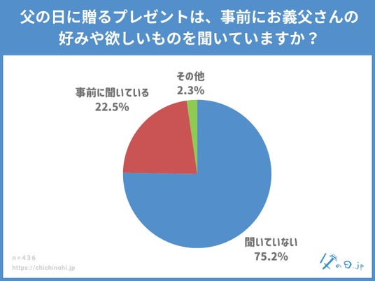 父の日に贈るギフトについて、「相手に事前に希望を聞いてから選ぶか」という質問に対し、「聞かずに選ぶ」と回答した人は全体の74.6%にのぼりました。義父に対しても同様に75.2%が「聞かない」と回答しており、実父・義父を問わず、ギフトは“こちらから選ぶもの”という傾向が根強いことが明らかになりました。