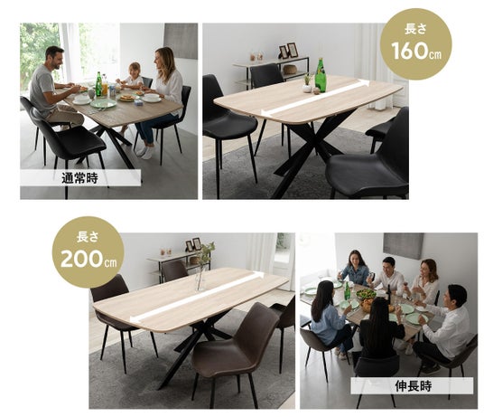 普段は大人4人掛けでもゆったり使えるサイズ。来客時には6~8人まで対応できる伸長式のダイニングテーブルです。シーンに合わせて、長さを約160cmから約200cmまで拡張できます。