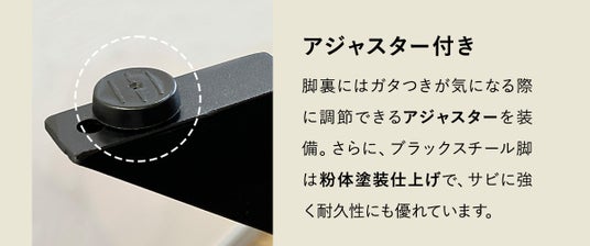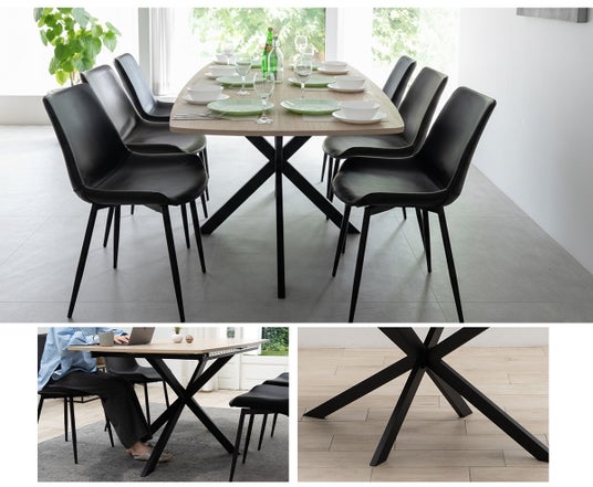 マットブラックのスチール脚が木目調の天板と調和し、ナチュラルでありながら洗練された印象を演出。クロス構造により高い安定感を実現し、椅子の配置や足元の動線を邪魔しません。どんなインテリアにも自然に溶け込むデザインです。