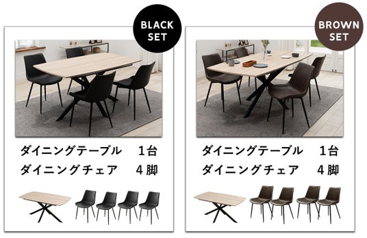 ダイニング5点セットには、高級感のある洗練されたデザインのチェアが同色4脚、付属します。チェア色はブラック、ブラウンの2色からお選びいただけます。