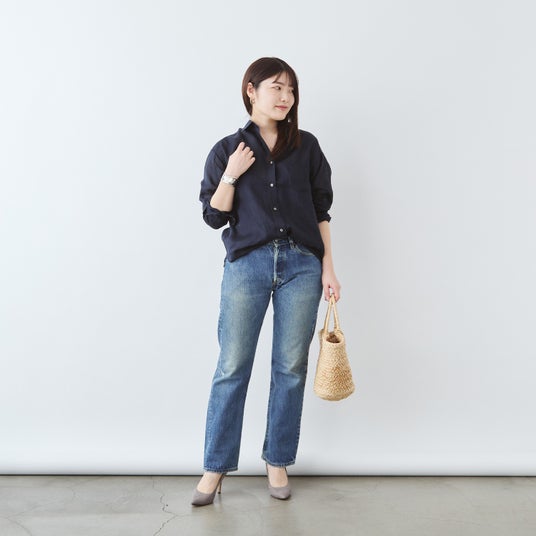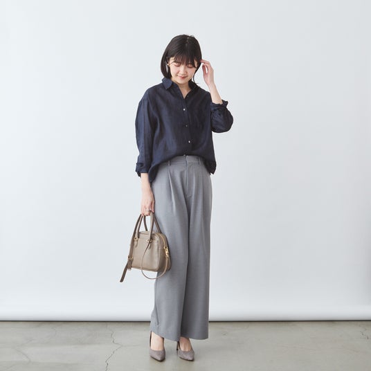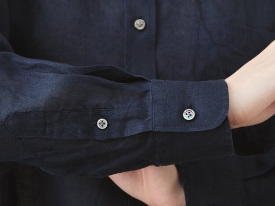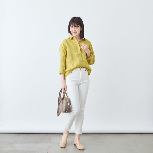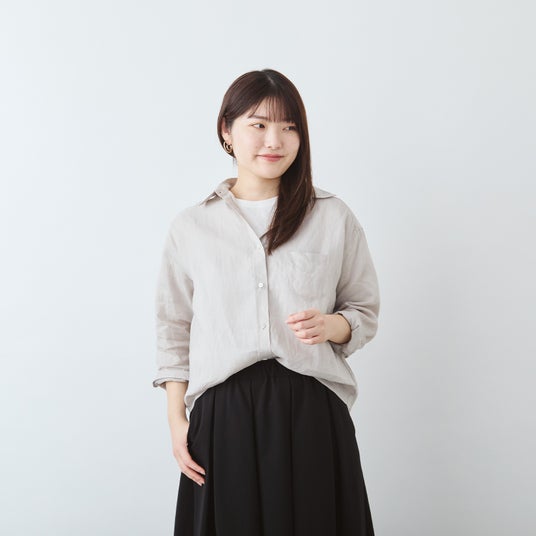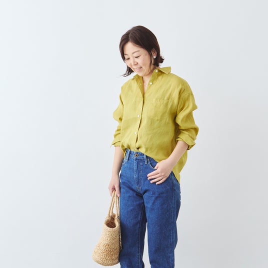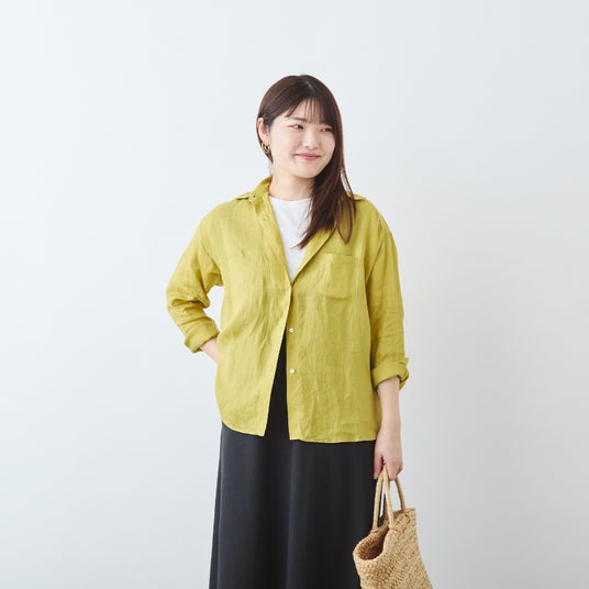 リネンの生地にハリ感があるため、襟の立ちや、袖をまくった感じ、全体のフォルムが簡単に決まりやすいです。
