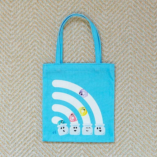 鮮やかなカラーやユニークな雰囲気はそのままに、表と裏で絵が変わるしかけ絵本のようなミニトートバッグが完成しました!