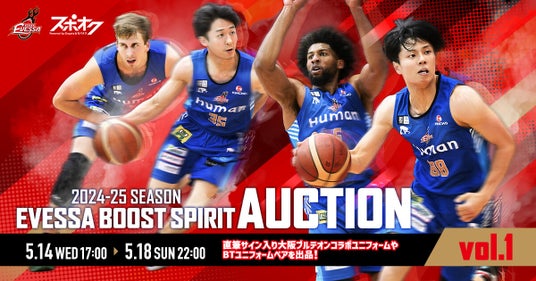 大阪エヴェッサは、2024-25シーズンの熱い応援に感謝を込めて、「EVESSA BOOST SPIRIT AUCTION」を開催いたします。選手が共に闘い抜いた着用ユニフォームや、ガールズパフォーマンスユニット「BT」の魂が宿るサイン入りベアなど、想いの詰まった今シーズン特別なアイテムを出品いたします。