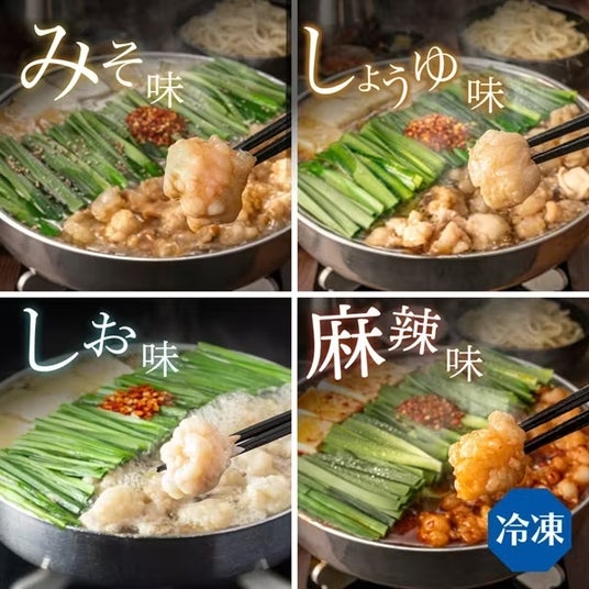 「博多もつ鍋おおやま」では、九州産を中心とした国産牛の小腸を用いたもつ鍋を提供。店舗では〈みそ/しょうゆ/水炊き風(にんにく不使用)〉の3種を基本に、通販では〈濃厚みそ/しょうゆ/しお(ネット限定)/麻辣〉などのラインアップを展開しています。