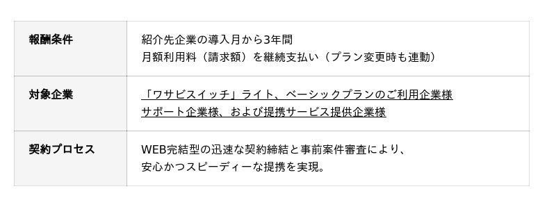 株式会社ワサビビジネスパートナー(販売代理店)制度を実施し、実際の利用・提携企業への3年間の収益を共有。EC事業者の持続的な成長を支援