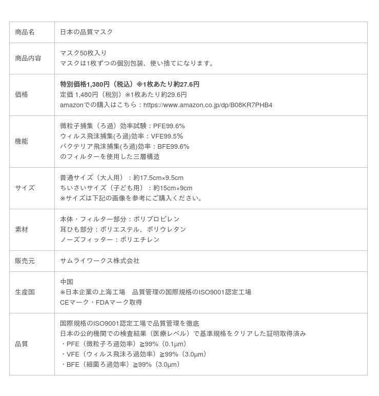 サムライワークス株式会社国際規格(ISO9001)認定の中国工場で品質管理を徹底して製造された、フィルターカット率PFE99.6%、BFE99.6%、VFE99.5%の「日本品質マスク」がamazonにてタイムセール開始!