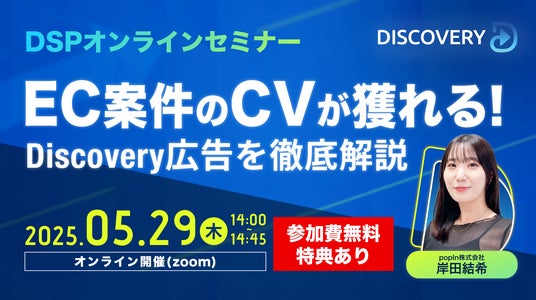 popIn株式会社(本社:東京都港区、代表取締役社長:姜鋒、以下 popIn)は、2025年5月29日(木)14:00より「DSPオンラインセミナー"EC案件のCVが獲れる!Discovery広告を徹底解説"」を開催いたします。本セミナーは、DSPサービスとして生まれ変わった「Discovery DSP」のリニューアル後、初のオンラインセミナーです。