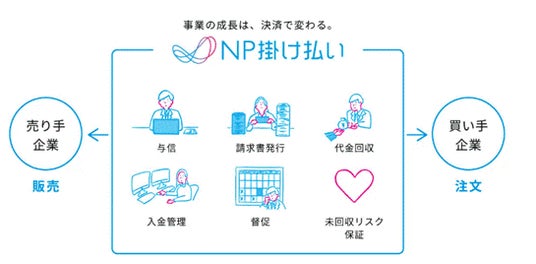 https://www.w2solution.co.jp/「NP掛け払い」について「NP掛け払い」は、企業間取引(BtoB)向けの後払い決済サービスです。当社が売り手企業と買い手企業の間に入り、買い手企業への与信から請求書発行、代金回収までの決済・請求業務全てを請け負います。NP掛け払いの導入により、売り手は決済・請求業務をまるごとDX化し、本来業務により集中できます。また未回収リスクの保証もするため、経営基盤の安定化を図れます。さらには、従来の信用機関に依存しない独自の与信審査によって、個人事業主を含む事業者に対して与信通過率99%(※1)と柔軟に掛け売りを提供することができ、販路拡大・売上向上が見込めます。買い手は掛け払いを利用することで、キャッシュフローの改善を期待できます。