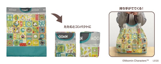 緑や青のパターン柄を基調に「ムーミン」のキャラクターがデザインされた、「エコバッグ」「マルチケース」「チャーム付きラバーキーホルダー」「ジッパーバッグ付きメモ」「メモスタンド」の5アイテムです。