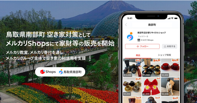 株式会社メルカリ(以下、メルカリ)と株式会社ソウゾウ(以下、ソウゾウ)は、鳥取県南部町と連携し、公民連携による空き家利活用として「メルカリShops(メルカリショップス)」にてまだ使える家財等の販売(※1)を開始いたします。なお、自治体と連携した空き家対策はメルカリグループとして初の取り組みです。