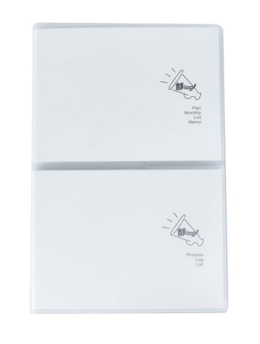 ▼部活手帳 部log 特長手帳カバーに異なるレイアウトの手帳が2冊収納されています。手帳本体はハードカバー仕立て。さらに、ポリ塩化ビニール(PVC)素材の手帳カバーで強度を補強し、部活の練習時に立ったままサッとその場で書き込みができるよう工夫を凝らしました。