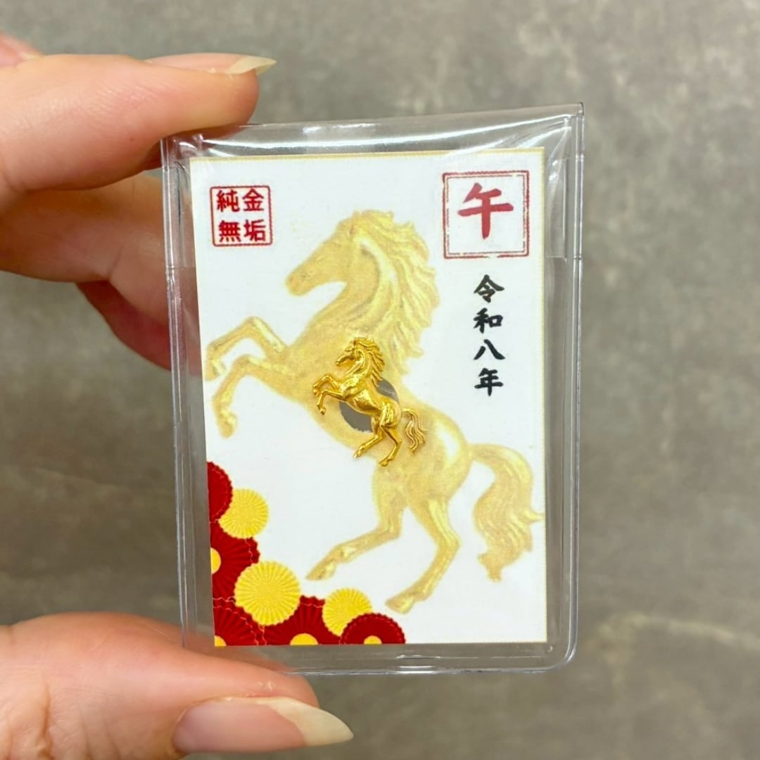 純金の午年のお守り「跳ねる馬」約1g。「令和八年」「干支シリーズ」。