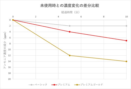 グラフはスチームタイプの例ですが、消臭剤未使用時とのアンモニア濃度の差分を比較すると、開始10分後にベーシックは2ppm、プレミアムは7ppm、プレミアムゴールドは14ppmとなっており、消臭性能がアップしていることがわかります。他タイプにおいても、ベーシックシリーズ比較約400%の結果が得られています。