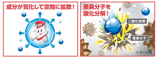 ※安定化二酸化塩素は、除菌消臭成分(二酸化塩素ガス)を発生させ、悪臭分子やウイルス・菌を除去します。