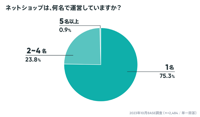 ネットショップの運営体制は、「個人」が71.7%、「法人(団体)」が28.3%と「個人」が7割を超える結果になりました。「法人(団体)」の利用割合は3年連続で増加しており、「個人」で運営していたネットショップが規模を拡大して法人化したことや、新型コロナウイルス感染症拡大の影響や新規事業の一環でネットショップを開設する法人が増えたと考えられます。ネットショップの運営人数も、例年同様に「1名」が75.3%ともっとも多く、次いで「2~4名」が23.8%と、2019年に調査を開始してから5年連続で変わらず、4名以下のショップが99%を占めています。