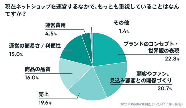 ネットショップで取り扱う商品に関する設問では、「オリジナル商品」が76.1%、「セレクト商品」が23.9%と、7割以上のショップがオリジナルの商品を扱っていることがわかりました。また、「現在ネットショップを運営するなかで、もっとも重視していることはなんですか?」の設問に対する回答は、2019年の調査開始から変わらず5年連続で1位は、「ブランドコンセプト・世界観の表現」22.8%で、自身のブランドや、自身の好みの価値観の表現を最も重要視するショップが最も多く、2位は僅差で「顧客やファン、見込み顧客との関係づくり」20.7%となり、近年注目されているCRM(Customer Relationship Management)も重要視していることがわかりました。