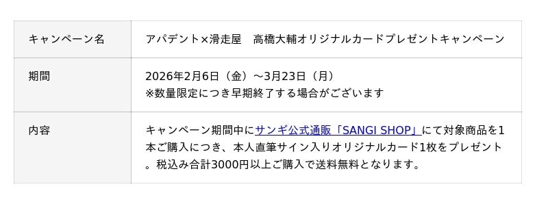 アパデント 」は、プロフィギュアスケーター高橋大輔さんフルプロデュースの氷上エンターテインメント「滑走屋」へ協賛いたします。協賛を記念して、アパデント対象商品を購入すると高橋大輔オリジナルカードがもらえるプレゼントキャンペーンを