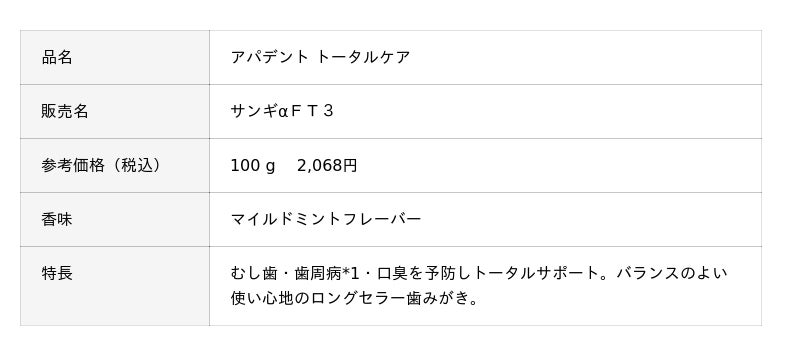 歯みがき剤「アパデント」は、薬用ハイドロキシアパタイトによるむし歯予防に加えて、歯周病*1、口臭などオーラルヘルスを損なうリスクから守るトータルケアブランドです。