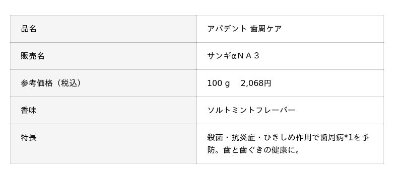 歯みがき剤「アパデント」は、NASAのアイデアをヒントに生まれた革新的*オーラルケアブランド。本商品には、歯垢を吸着除去し、ミネラルが溶け出したエナメル質の欠損部に成分補給して修復・再石灰化という3つの作用でエナメル質を整え、むし歯を予防してくれるサンギ開発の独自成分「薬用ハイドロキシアパタイト」を配合しています。