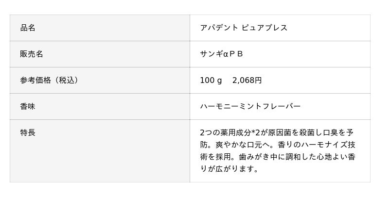 特に、歯周病*1を予防したい方には「アパデント 歯周ケア」、口臭ケアしたい方には「アパデント ピュアブレス」がおすすめです。