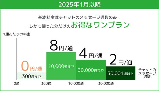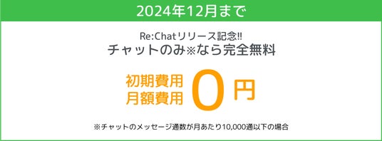 導入時は、「お客様からの問い合わせ数が想定できず、無駄なコストになる可能性がある」「チャットを導入したいが、そこまでアクセス数がないためチャットにまで費用をかけたくない」というお悩みを解消するため、「Re:Chat」は月間300通以下なら永年無料で使える体系としました。また、リリースを記念し、通常は301通目から発生する8円/通の料金を年内は10,000通まで無料とするキャンペーンを実施いたします。