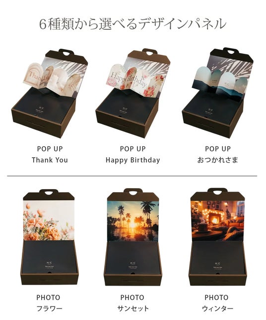 「Happy Birthday」や「Thank You」など、用途に合わせた箱デザインが豊富です。