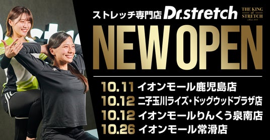 世界250店舗以上で独自技術「コアバランスストレッチ」を提供するストレッチ専門店『Dr.stretch』(株式会社nobitel、本社:東京都新宿区、代表取締役:黒川 将大)は、10月にDr.stretch イオンモール鹿児島店、二子玉川ライズ・ドッグウッドプラザ店、イオンモールりんくう泉南店、イオンモール常滑店をオープンいたします。