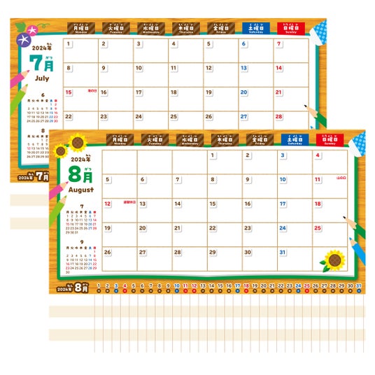 ▼おやこ夏休みてちょう2024ページ構成1.マンスリーカレンダー&ガントチャート
