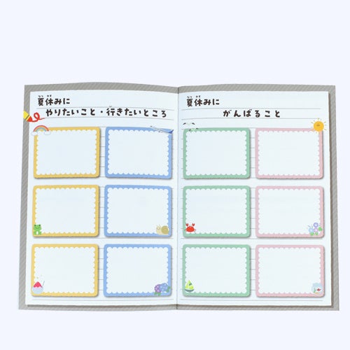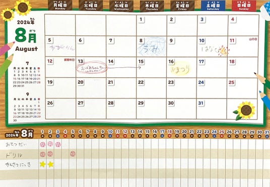 ・夏休みを規則正しく過ごすための計画をたて自立心を育む、マンスリーカレンダー&ガントチャート(別紙仕立てで壁に貼る事ができます。)・夏休みにやりたい事、頑張りたい事を記入できるワクワクページ・日々のできごとを記入するデイリーページ。保護者のコメントを記入すれば親子の交換日記として形に残ります。・サラサラとした紙を使用。色鉛筆、芯だけの色鉛筆で記入すると綺麗に発色します。