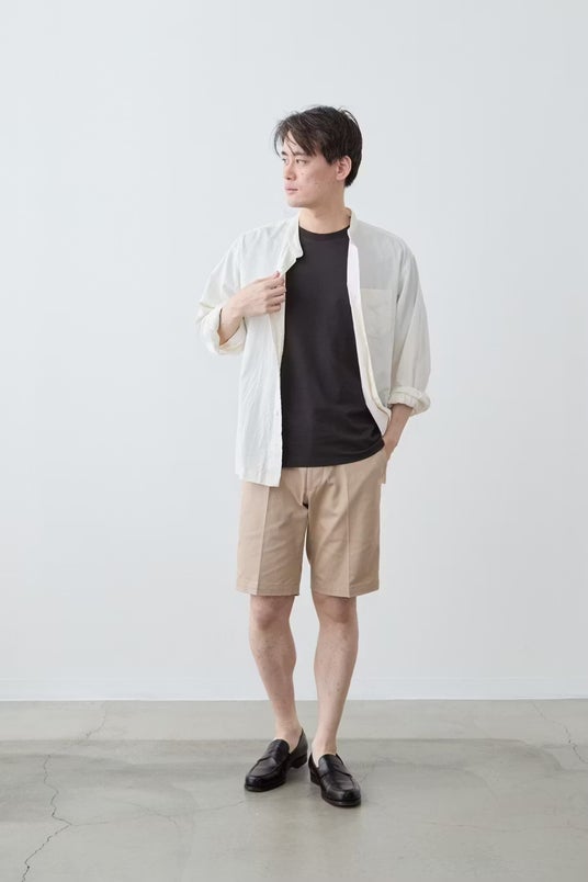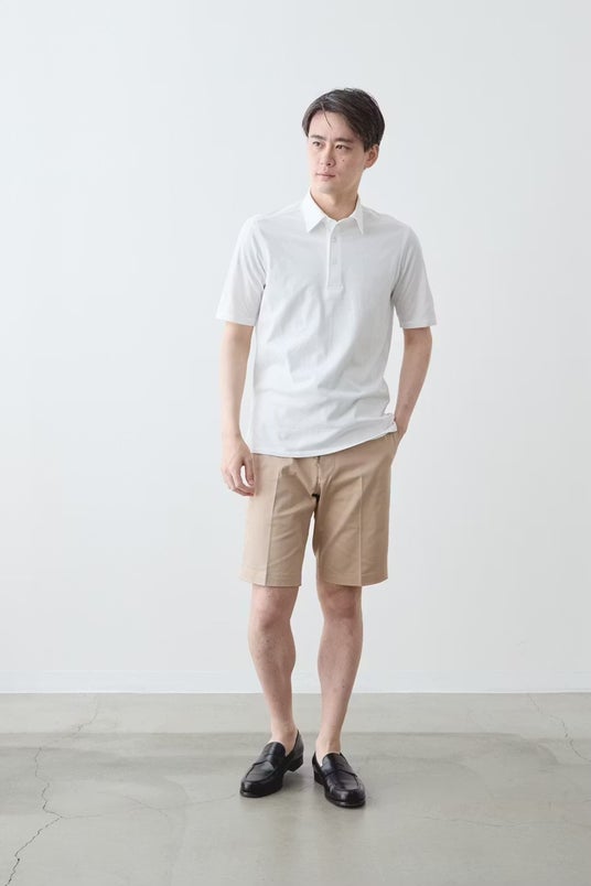 「ファインチノ トラウザーハーフパンツ」は、ヒップとワタリにゆとりを持たせ、窮屈感のないリラックスな穿き心地。