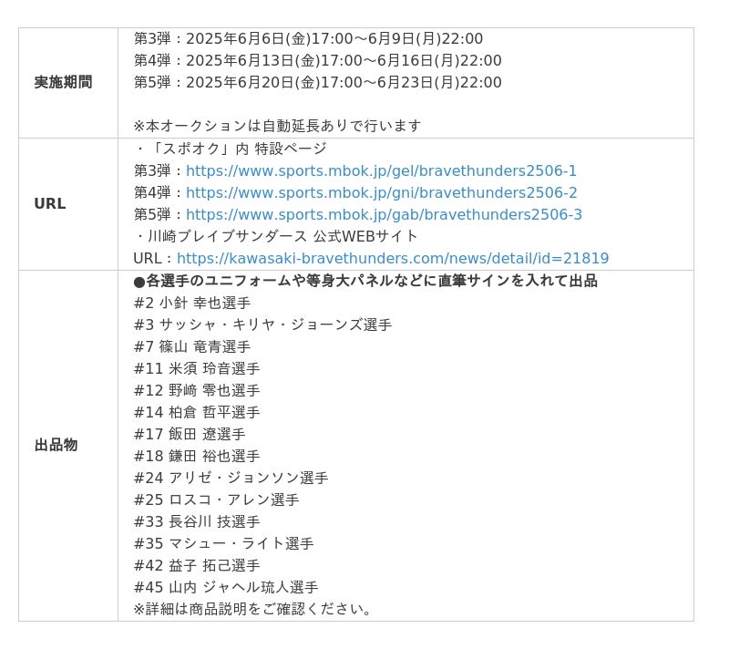 株式会社モバオク 株式会社モバオク(本社:東京都渋谷区、代表取締役社長:小一原 宏樹、以下モバオク)がエンゲート株式会社(本社:東京都中央区、代表取締役:城戸 幸一郎、以下エンゲート)と業務提携し提供するスポーツチーム公式オークションサービス「スポオク」にて、B.LEAGUE所属の川崎ブレイブサンダースによる『川崎ブレイブサンダース 2024-25シーズンオークション』が2025年6月6日(金)からスタートします。