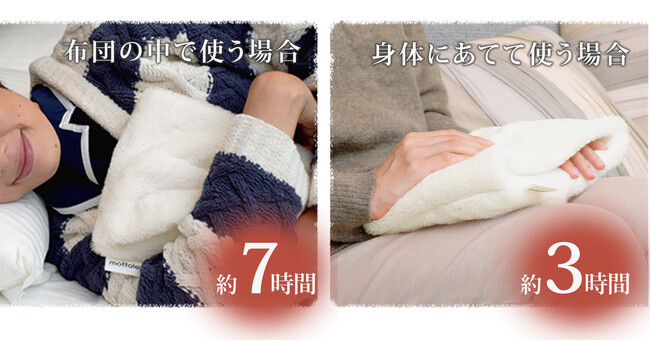 布団の中で使う場合は約7時間、身体にあてて使う場合は約3時間、温かさが持続します。