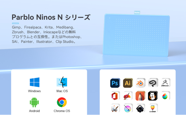 イングレート・ジャパン株式会社2022年5月に新発売されたエントリーモデルペンタブレットParblo Ninos Nシーリズは、誰でもペンタブレットを試してみえるために、10月4日まで半額キャンペーンを開催いたします。