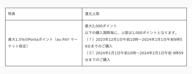 auコマース&ライフ株式会社auコマース&ライフは運営する総合ショッピングサイト「au PAY マーケット」において、2023年12月1日から2024年2月1日までの間、au PAY 残高決済を利用しお買い物された方を対象にご購入金額の最大1.5%のPontaポイント(au PAY マーケット限定)を追加で還元します。