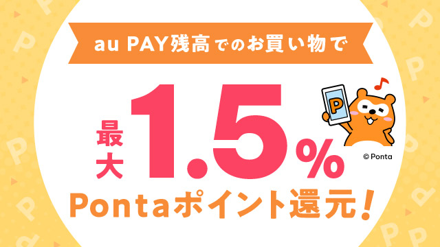 期間中に、キャンペーンページよりエントリーのうえ(クーポンを取得)、お支払い方法で「au PAY 残高」を選択しお買い物いただくと、購入金額に対して最大1.5%のPontaポイント(au PAY マーケット限定)を還元します。