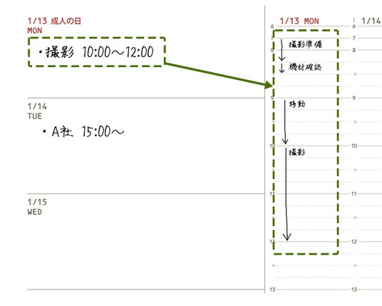 2.TODO(やる事)を細分化して時間の使い方を把握できる(週間バーチカルページ左枠)