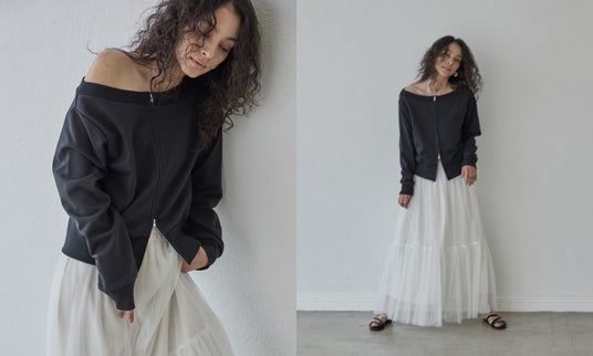 カジュアルに見えがちなスウェットもオフショルダーで大人の抜け感が叶う新作トップス。ダブルジップ仕様なので、少し下を開けてもバランスよく着こなしていただけます。