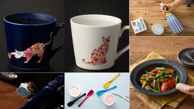 温かい飲み物を注ぐと絵柄が浮き出る岐阜県多治見市【丸モ高木陶器】のマグカップや、奈良県広陵町の靴下メーカー【昌和莫大小】が発明した「気化熱」の作用を利用したエコなボトルクーラーなど、ユニークな品から石川県加賀市の伝統工芸士が創り出す縁起の良い【うるしアートはりや】の蒔絵の富士山ピンなど。使って楽しく、気持ちも上がる!日用品が多数登場。